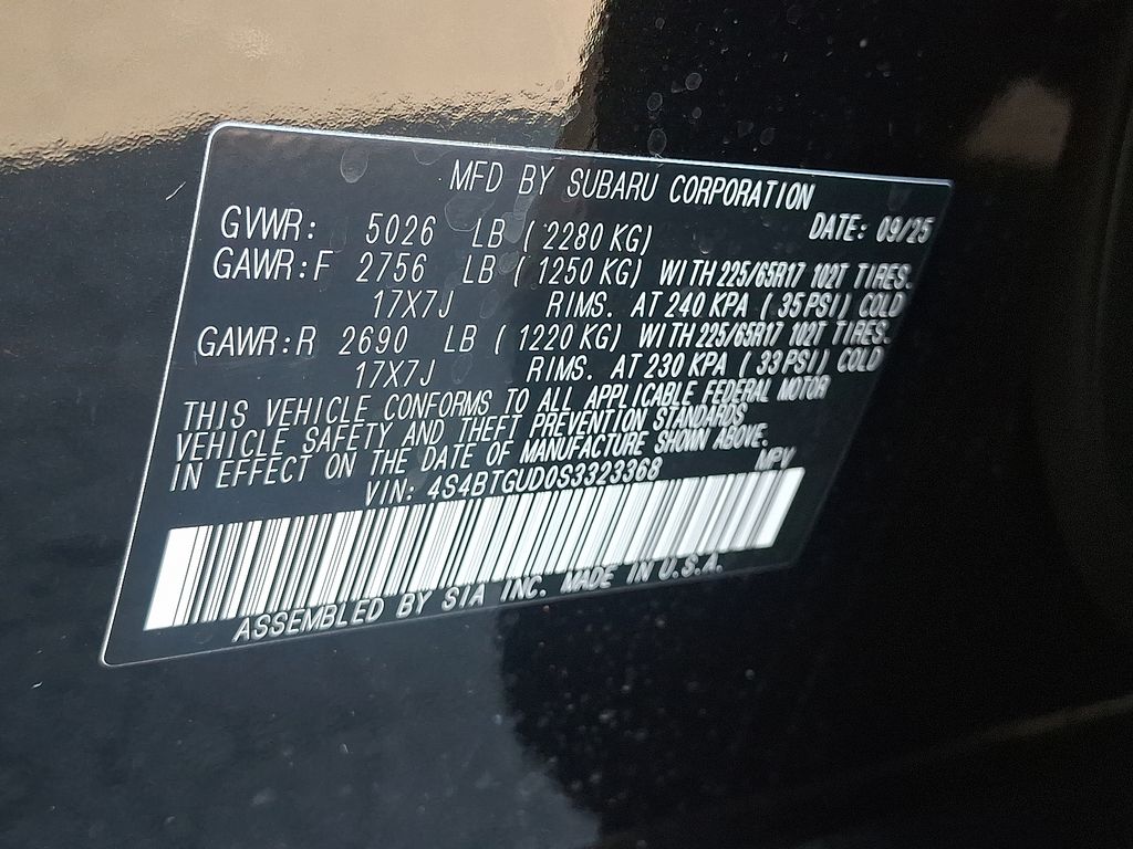 12 Speakers, 4-Wheel Disc Brakes, ABS brakes, Air Conditioning, Alloy wheels, AM/FM radio: SiriusXM with 360L, Apple CarPlay & Android Auto, Auto High-beam Headlights, Auto-Dimming Exterior Mirror w/Approach Light, Auto-dimming Rear-View mirror, Automatic temperature control, Brake assist, Cargo Sidewall Protector, Compass, Driver door bin, Driver vanity mirror, Dual front impact airbags, Dual front side impact airbags, Electronic Stability Control, Emergency communication system: MySubaru Safety (3-year free trial), Exterior Parking Camera Rear, Four wheel independent suspension, Front anti-roll bar, Front Bucket Seats, Front Center Armrest w/Storage, Front dual zone A/C, Front fog lights, Front reading lights, Fully automatic headlights, Garage door transmitter: HomeLink, harman/kardon® Speakers, Heated door mirrors, Heated Front Bucket Seats, Heated front seats, Heated rear seats, Heated steering wheel, Illuminated entry, Knee airbag, Leather steering wheel, LED Upgrade, Low tire pressure warning, Occupant sensing airbag, Outside temperature display, Overhead airbag, Overhead console, Panic alarm, Passenger door bin, Passenger vanity mirror, Power door mirrors, Power driver seat, Power Liftgate, Power Moonroof, Power Moonroof & Navigation & RAB, Power passenger seat, Power steering, Power windows, Radio: Subaru 11.6" Multimedia Plus System, Radio: Subaru 11.6" Multimedia System w/Navigation, Rear anti-roll bar, Rear Seat Back Protector, Rear seat center armrest, Rear window defroster, Rear window wiper, Remote keyless entry, Reverse Automatic Braking (RAB) System, Roof rack, Security system, Speed control, Speed-sensing steering, Splash Guards, Split folding rear seat, Spoiler, StarTex-Trimmed Upholstery, Steering wheel mounted audio controls, Tachometer, Telescoping steering wheel, Tilt steering wheel, Traction control, Trip computer, Turn signal indicator mirrors, Variably intermittent wipers, Wheels: 17" x 7J Matte Black Aluminum-Alloy, Wilderness Package, Wireless Charger.