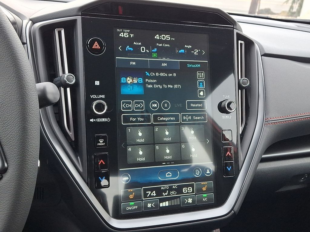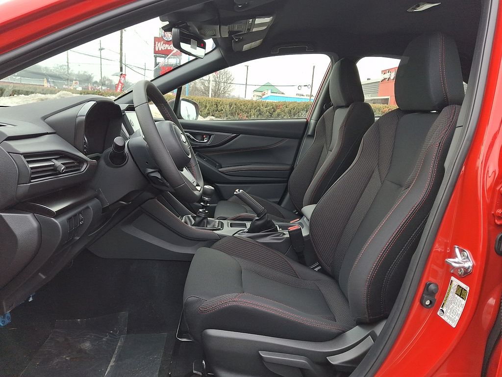 4-Wheel Disc Brakes, 6 Speakers, ABS brakes, Air Conditioning, Alloy wheels, AM/FM radio: SiriusXM, Auto High-beam Headlights, Automatic temperature control, Brake assist, Bumpers: body-color, Driver door bin, Driver vanity mirror, Dual front impact airbags, Dual front side impact airbags, Electronic Stability Control, Emergency communication system, Exterior Parking Camera Rear, Four wheel independent suspension, Front anti-roll bar, Front Bucket Seats, Front Center Armrest, Front dual zone A/C, Front fog lights, Front reading lights, Fully automatic headlights, Heated door mirrors, Heated front seats, Illuminated entry, Knee airbag, Leather Shift Knob, Leather steering wheel, Low tire pressure warning, Occupant sensing airbag, Outside temperature display, Overhead airbag, Overhead console, Panic alarm, Passenger door bin, Passenger vanity mirror, Performance Design Heated Front Bucket Seats, Power door mirrors, Power steering, Power windows, Premium Cloth Upholstery w/Red Stitching, Radio data system, Radio: Subaru 11.6" Multimedia Plus System, Rear anti-roll bar, Rear seat center armrest, Rear window defroster, Remote keyless entry, Security system, Speed control, Speed-sensing steering, Split folding rear seat, Spoiler, Sport steering wheel, Steering wheel mounted audio controls, Tachometer, Telescoping steering wheel, Tilt steering wheel, Traction control, Trip computer, Variably intermittent wipers, Wheels: 18" x 8.5" Dark Gray Finish Alum Alloy.
