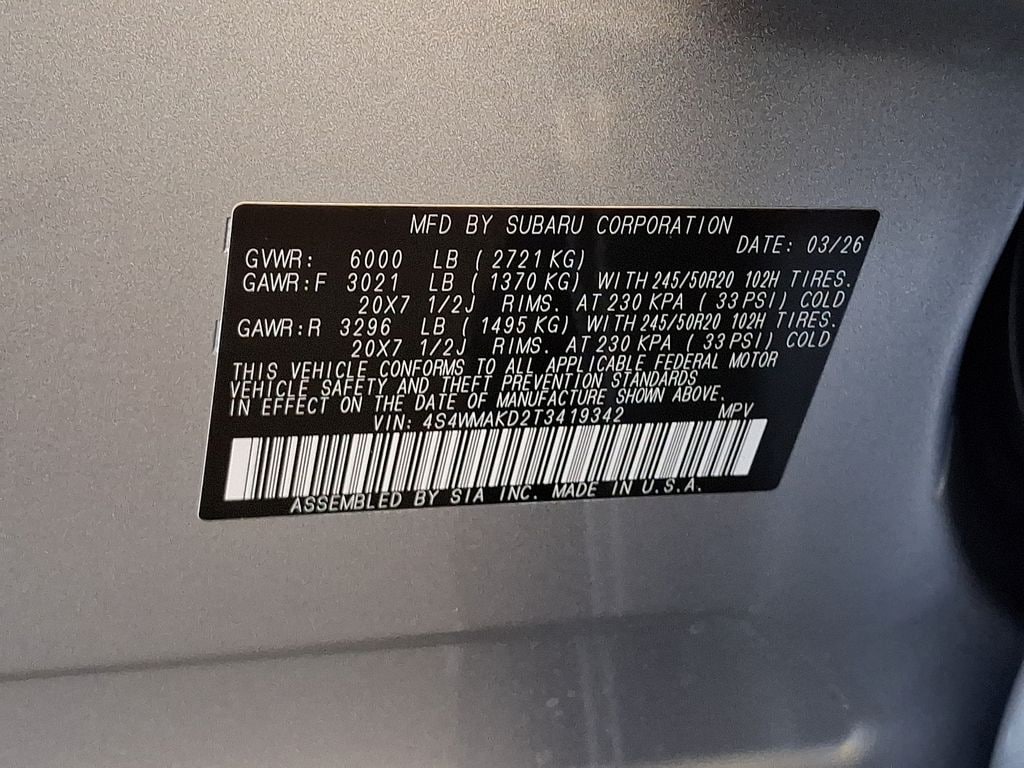 14 Speakers, 3rd row seats: bench, 4-Wheel Disc Brakes, ABS brakes, Air Conditioning, Alloy wheels, AM/FM radio: SiriusXM with 360L, Apple CarPlay & Android Auto, Auto High-beam Headlights, Auto-dimming Rear-View mirror, Automatic temperature control, Brake assist, Bumpers: body-color, Compass, Delay-off headlights, Driver door bin, Driver vanity mirror, Dual front impact airbags, Dual front side impact airbags, Electronic Stability Control, Emergency communication system: MySubaru Companion (5-years free), Exterior Parking Camera Rear, Four wheel independent suspension, Front anti-roll bar, Front Bucket Seats, Front Center Armrest, Front dual zone A/C, Front fog lights, Front reading lights, Fully automatic headlights, Garage door transmitter: HomeLink, harman/kardon® Speakers, Heated and Ventilated Front Bucket Seats, Heated door mirrors, Heated front seats, Heated rear seats, Heated steering wheel, HVAC memory, Illuminated entry, Knee airbag, Leather Shift Knob, Leather steering wheel, Low tire pressure warning, Memory seat, Navigation system: MySubaru Navigator (1-year trial), Occupant sensing airbag, Outside temperature display, Overhead airbag, Overhead console, Panic alarm, Passenger door bin, Passenger vanity mirror, Perforated Nappa Leather-Trimmed Upholstery, Power door mirrors, Power driver seat, Power Liftgate, Power moonroof, Power passenger seat, Power steering, Power windows, Radio data system, Radio: Subaru 11.6" Multimedia System with Navigation, Rain sensing wipers, Rear air conditioning, Rear anti-roll bar, Rear reading lights, Rear window defroster, Rear window wiper, Reclining 3rd row seat, Remote keyless entry, Security system, Speed control, Speed-sensing steering, Split folding rear seat, Spoiler, Steering wheel mounted audio controls, Tachometer, Telescoping steering wheel, Tilt steering wheel, Traction control, Trip computer, Turn signal indicator mirrors, Variably intermittent wipers, Ventilated front seats, Wheels: 20" x 7.5 J Dark Gray Alloy with Machine Finish.