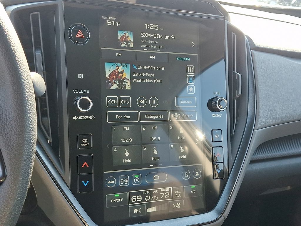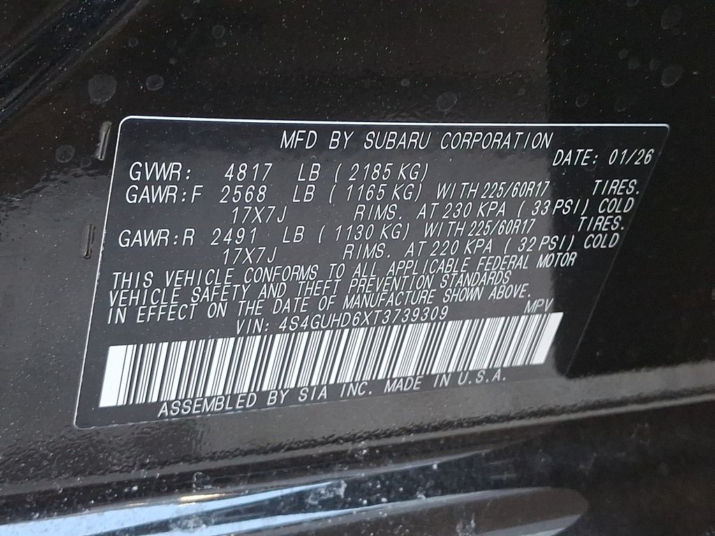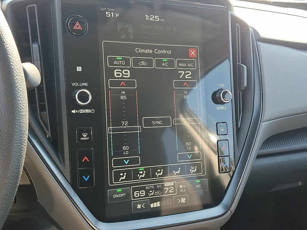 4-Wheel Disc Brakes, 6 Speakers, ABS brakes, Air Conditioning, Alloy wheels, AM/FM radio: SiriusXM with 360L, Anti-whiplash front head restraints, Auto High-beam Headlights, Automatic temperature control, Brake assist, Bumpers: body-color, Cloth Upholstery, Driver door bin, Driver vanity mirror, Dual front impact airbags, Dual front side impact airbags, Electronic Stability Control, Emergency communication system: MySubaru Companion (5-years free), Exterior Parking Camera Rear, Four wheel independent suspension, Front anti-roll bar, Front Bucket Seats, Front Center Armrest, Front dual zone A/C, Front fog lights, Front reading lights, Fully automatic headlights, Illuminated entry, Knee airbag, Low tire pressure warning, Occupant sensing airbag, Outside temperature display, Overhead airbag, Overhead console, Panic alarm, Passenger door bin, Passenger vanity mirror, Power door mirrors, Power steering, Power windows, Radio data system, Radio: Subaru 11.6" Multimedia Plus System, Rear anti-roll bar, Rear seat center armrest, Rear side impact airbag, Rear window defroster, Rear window wiper, Remote keyless entry, Security system, Speed control, Speed-sensing steering, Split folding rear seat, Spoiler, Steering wheel mounted audio controls, Tachometer, Telescoping steering wheel, Tilt steering wheel, Traction control, Trip computer, Turn signal indicator mirrors, Variably intermittent wipers, Wheels: 17" x 7.0" J Machine Finish Aluminum-Alloy.