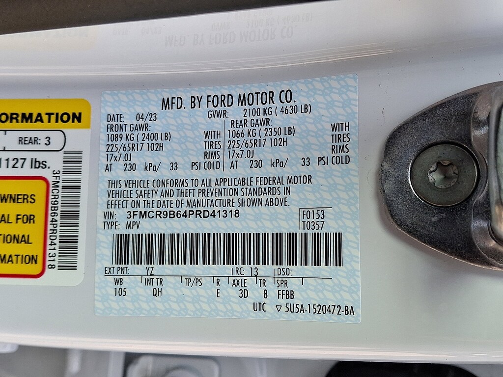CONVENIENCE PACKAGE Front Driver & Passenger Seatback Zipper Pockets, Leather-Wrapped Steering Wheel, Rear Parking Sensors, Wireless Charging Pad, Heated Front Bucket Seats, 8-way power drivers seat (fore/aft, up/down, recline, lumbar), LED Fog Lamps, Universal Garage Door Opener (UGDO), Intelligent Access (Lock/Unlock), push-button start and SecuriCode keyless-entry keypad, CARGO MANAGEMENT SYSTEM shelf, divider and table, ENGINE: 1.5L ECOBOOST auto start-stop technology (STD). Ford Big Bend with Oxford White exterior and Ebony interior features a 3 Cylinder Engine with 181 HP at 6000 RPM*.